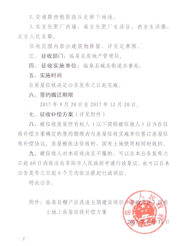 (六)本方案由临泉县国有土地上房屋征收办公室负责解释。